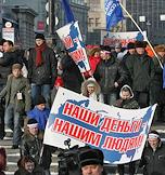 Всероссийская акция, организованная партией "Единая Россия", в поддержку антикризисных мер, принимаемых правительством и президентом, прошла на Манежной площади. Плакат "Наши деньги - нашим людям!".