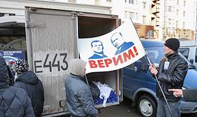 Участники Всероссийской акции, организованной партией "Единая Россия", в поддержку антикризисных мер, принимаемых правительством и президентом России, прошла на Манежной площади. Плакат с портретом Дмитрия Медведева и Владимира Путина и надписью "Верим!".