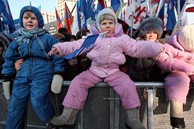 Всероссийская акция, организованная партией "Единая Россия", в поддержку антикризисных мер, принимаемых правительством и президентом, прошла на Манежной площади. Маленькие участники митинга.