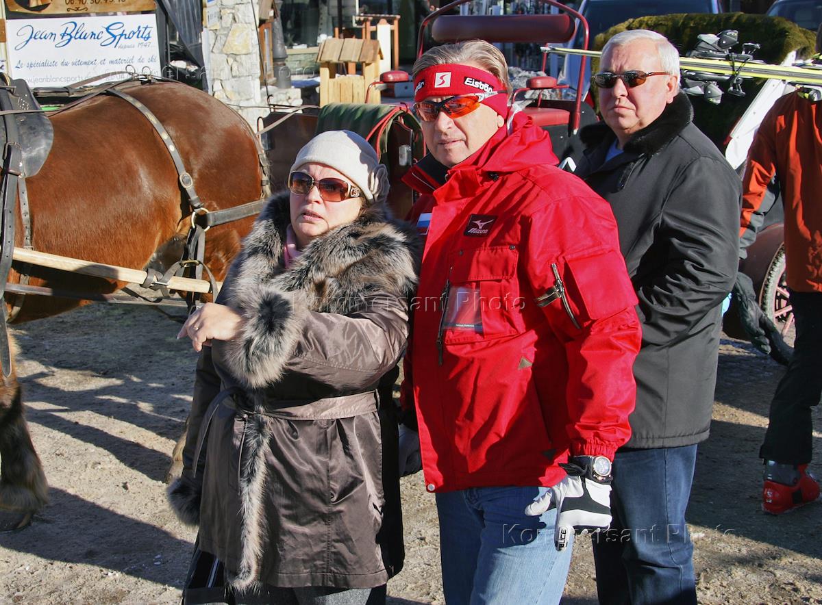 Russian Olympic Committee (OKR) President Leonid Tyagachev (in the center) and the director of the Federal Protection Service Evgeny Murov (right) om the scuare Kruazet of the ski resort Kurshevel.