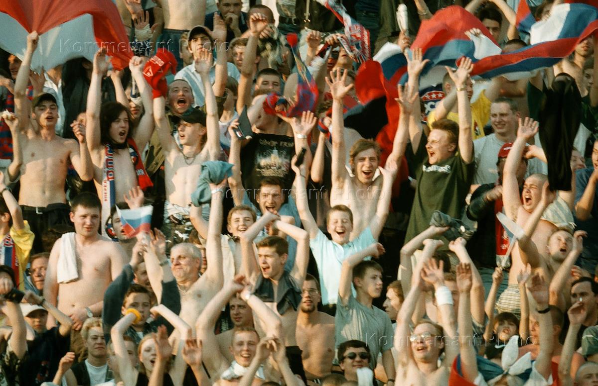 Exalted funs at tribunes during a soccer match of Russia and Island.