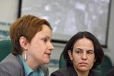 Исследователи отделения международной правозащитной организации Human Rights Watch (HRW) по Европе и Центральной Азии Мария Лисицына (слева) и Джейн Бьюкенан (справа) во время пресс-конференции представителей организации HRW, посвященной подготовленному HRW новому докладу о положении иностранных трудовых мигрантов в России. Пресс-конференция прошла в центральном офисе агентства "Интерфакс".