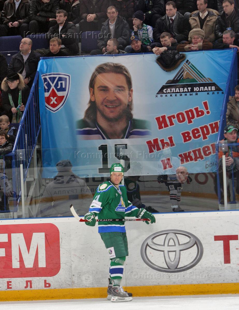 Континентальная хоккейная лига (КХЛ). Матч между командами "Салават Юлаев" (Уфа) - "Авангард" (Омск) на стадионе УСА "Уфа-Арена". Плакат с надписью "Игорь! Мы верим и ждем!".