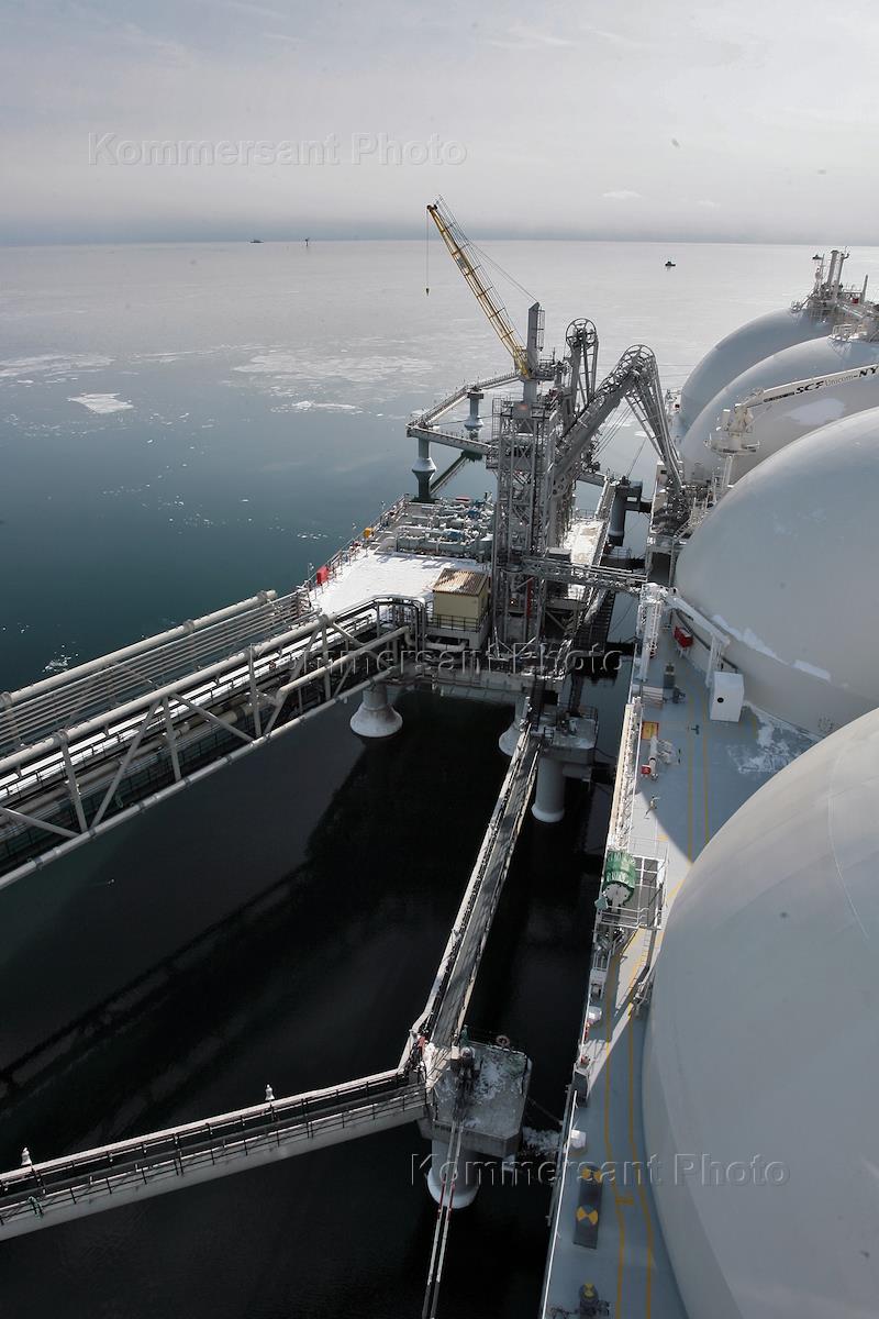 Танкер-газовоз "Гранд Анива", который будет использоваться для перевозки сахалинского сжиженного природного газа. Завод по производству сжиженного природного газа построен в рамках реализации проекта "Сахалин-2".