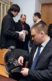 Подозреваемые в убийстве журналистки Анны Политковской бывший сотрудник московского УБОПа Сергей Хаджикурбанов (второй справа) и Ибрагим Махмудов (справа) перед началом заседания Московского окружного военного суда.