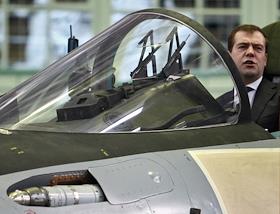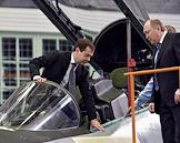 Президент ОАО "Объединенная авиастроительная корпорация" (ОАК) Алексей Федоров (в центре) и президент России Дмитрий Медвдедев (справа) во время посещения Иркутского авиационного завода.