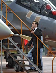 Президент России Дмитрий Медведев (слева) во время посещения Иркутского авиационного завода.
