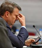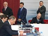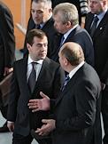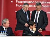 Председатель совета директоров ЗАО "Ренова", председатель комитета по международной деятельности РСПП Виктор Вексельберг (стоит слева), глава Сбербанка России Герман Греф (стоит в центре), председатель Наблюдательного совета "БазЭл" (Базовый элемент) Олег Дерипаска (стоити справа), председатель Внешэкономбанка Владимир Дмитриев (сидит слева) и заместитель председателя Совета Федерации Дмитрий Мезенцев (сидит справа) во время расширенного заседания президиума Государственного совета по вопросам повышения эффективности мер государственной поддержки реального сектора экономики.
