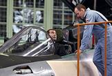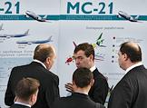Президент России Дмитрий Медведев (слева на первом плане), президент ОАО "Объединенная авиастроительная корпорация" (ОАК) Алексей Федоров (справа на первом плане), полномочный представитель президента России в сибирском федеральном округе Анатолий Квашнин (слева на втором плане) и директор Иркутского авиационного завода, вице-президент НПК "Иркут" Александр Вепрев (в центре на втором плане) во время посещения президентом России Иркутского авиационного завода.