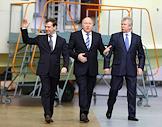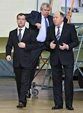 Слева направо: президент России Дмитрий Медведев, президент ОАО "Объединенная авиастроительная корпорация" (ОАК) Алексей Федоров и директор Иркутского авиационного завода, вице-президент НПК "Иркут" Александр Вепрев во время посещения президентом России Иркутского авиационного завода.