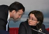 Помощник президента России Аркадий Дворкович (слева) и министр экономического развития России Эльвира Набиуллина (справа) во время расширенного заседания президиума Государственного совета по вопросам повышения эффективности мер государственной поддержки реального сектора экономики.