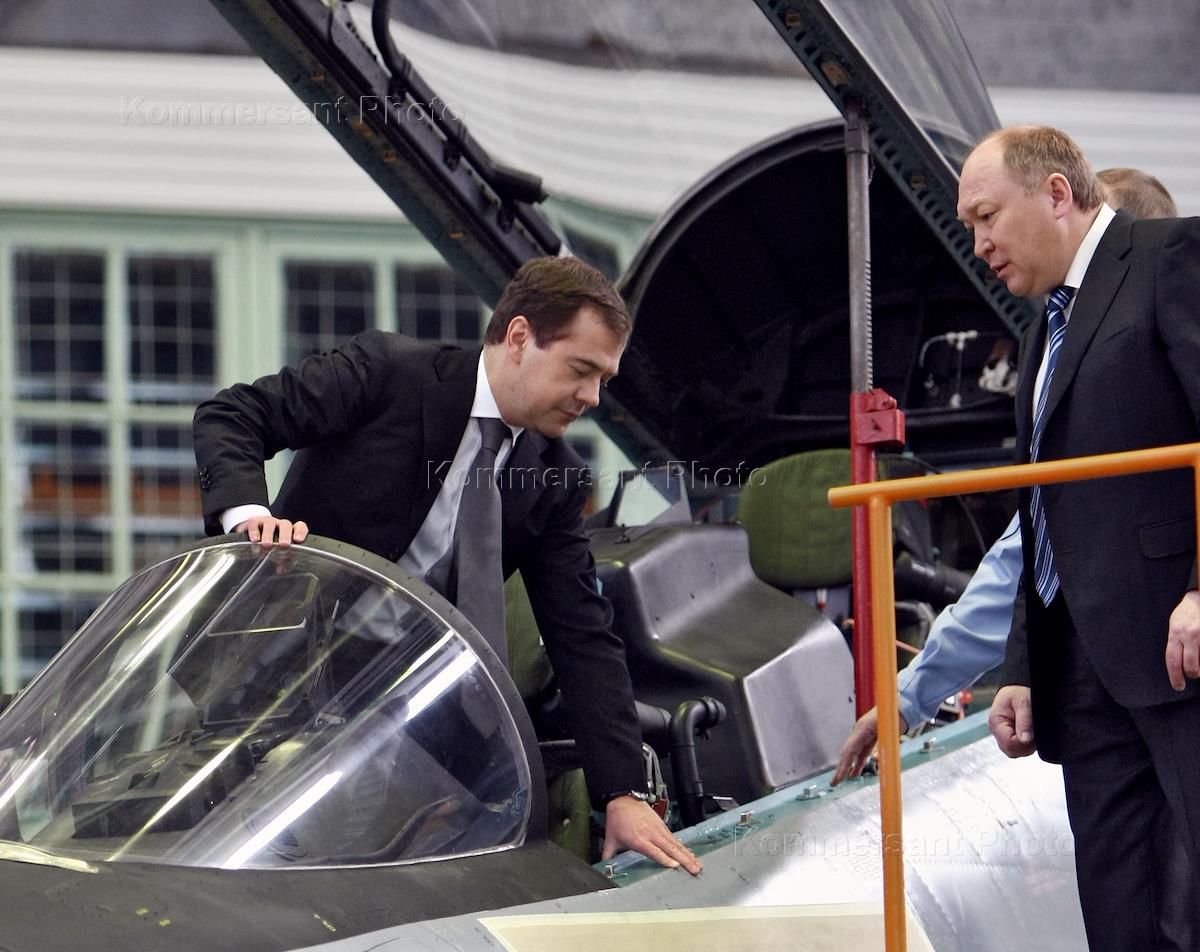 Президент ОАО "Объединенная авиастроительная корпорация" (ОАК) Алексей Федоров (справа) во время посещения президентом России Дмитрия Медведева (слева) Иркутского авиационного завода.