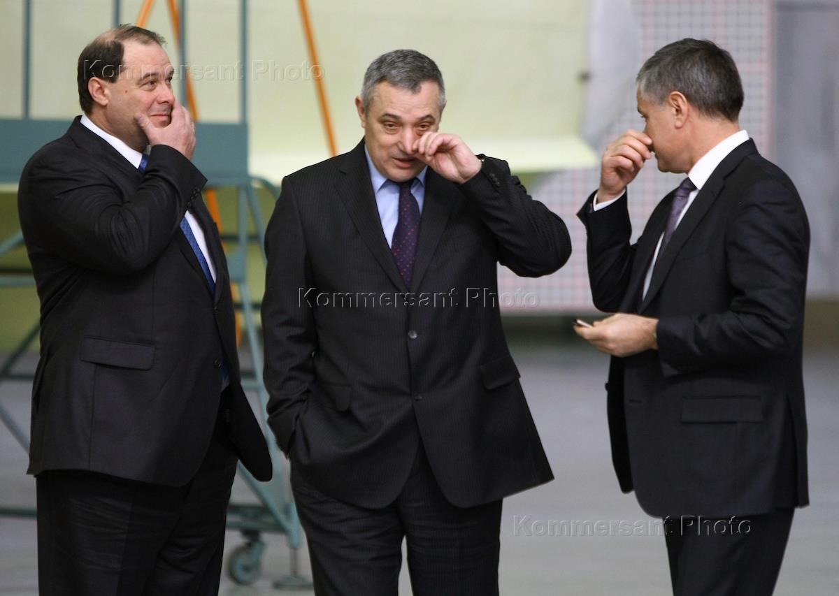 Слева направо: губернатор Иркутской области Игорь Есиповский, полномочный представитель президента России в Сибирском федеральном округе (СФО) Анатолий Квашнин и помощник президента России Александр Абрамов во время посещения Иркутского авиационного завода.