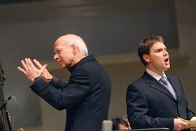 Дирижер Петер Нойманн (слева) и оперный певец Бенджамин Хьюлетт (справа) во время исполнения оратории Георга Фридриха Генделя "Мессия" оркестром Collegium Cartusianum из Кельна и Кельнским камерным хором в Концертном зале имени П.И.Чайковского.
