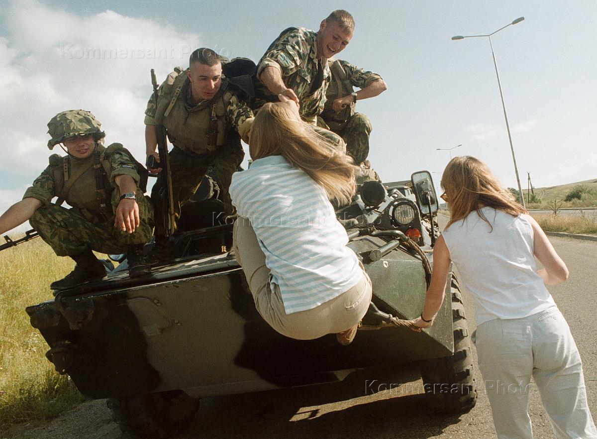 Сербские девушки при помощи солдат российских миротворческих сил в Косово пытаются залезть на броню российского БТРа.