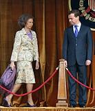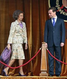 Королева Испании София (слева) и президент России Дмитрий Медведев (справа) во время встречи во дворце Эль-Пардо.