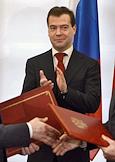 Слева направо: президент ОАО "Российские железные дороги" (РЖД) Владимир Якунин, президент ОАО "Группа Альянс" Муса Бажаев, президент, председатель правления "ВТБ Банк" Андрей Костин, президент России Дмитрий Медведев, глава РАО "Газпром" Алексей Миллер и заместитель председателя правительства России Игорь Сечин во время церемонии подписания ряда соглашений по итогам российско-испанских переговоров.