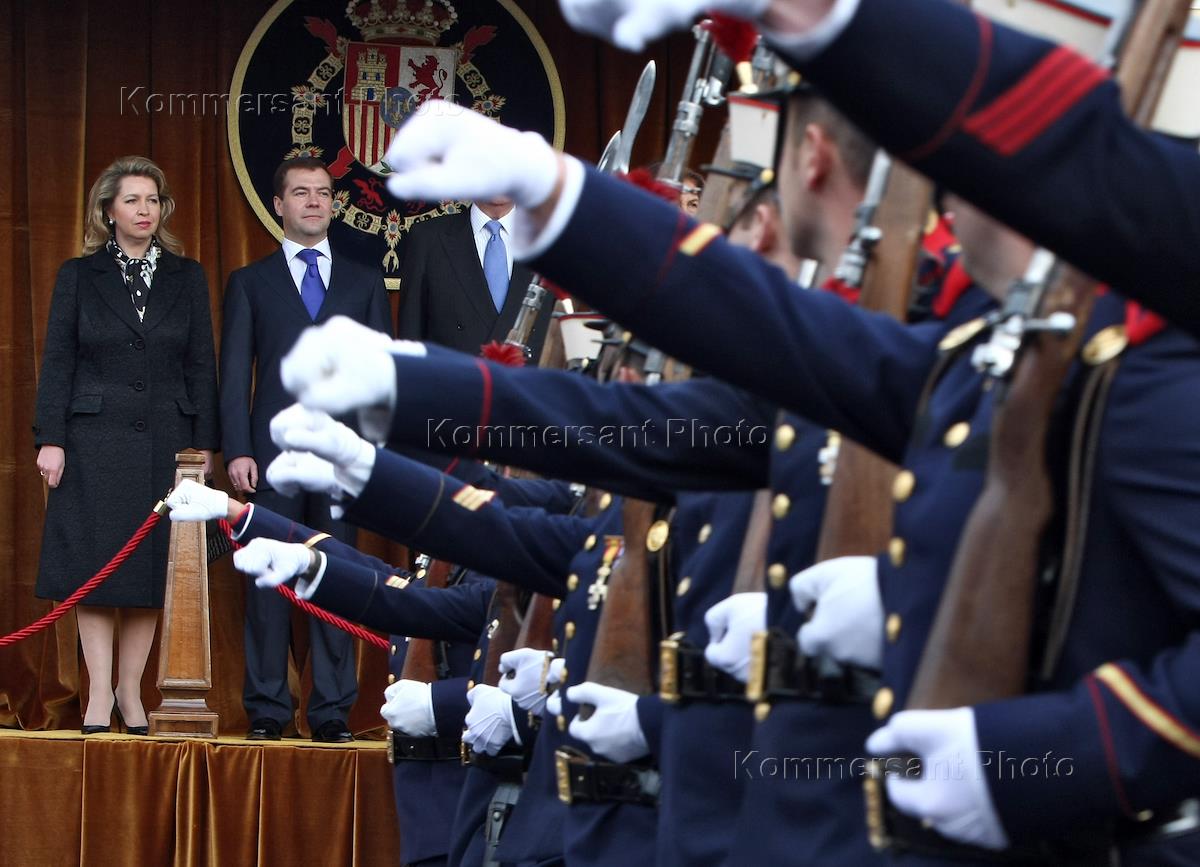 Официальная церемония встречи президента России Дмитрия Медведева с супругой Светланой с королем Испании Хуаном Карлосом I и королевой Софией во дворце Эль-Пардо.
