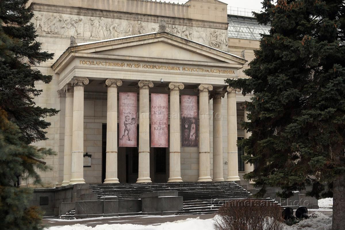 Здание Государственного музея изобразительных искусств (ГМИИ) имени А.С.Пушкина. Афиша выставки "От Дюрера до Клее. Немецкий, австрийский и швейцарский рисунок XV — XX веков из собрания ГМИИ" на фасаде здания.