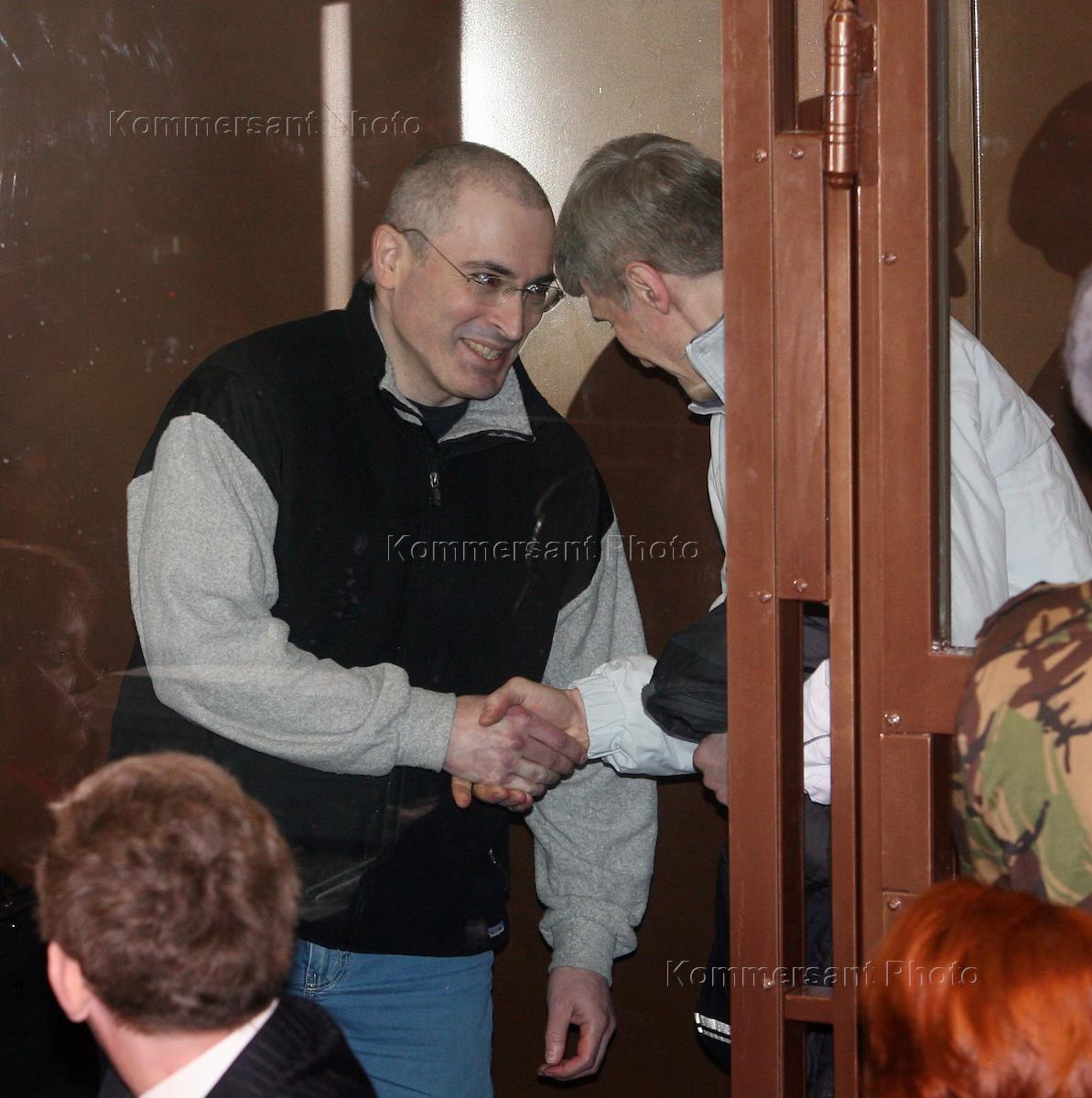 Бывший глава компании "ЮКОС" Михаил Ходорковский (слева) во время предварительных слушаний по второму уголовному делу в Хамовническом районном суде.