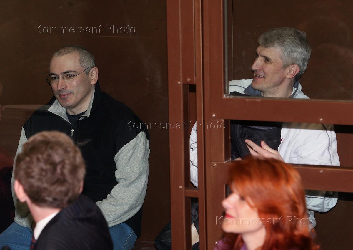 Former head of the company YUKOS Mikhail Hodorkovskiy (left) during the preliminary hearing of the second criminal case in Hamovnicheskiy district court.