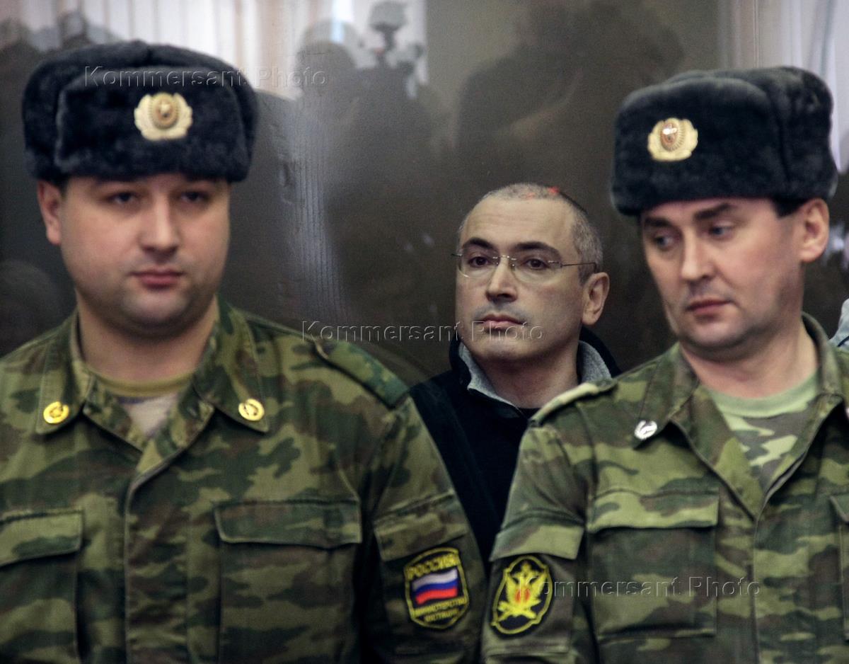 Бывший глава компании "ЮКОС" Михаил Ходорковский (в центре) во время предварительных слушаний по второму уголовному делу в Хамовническом районном суде.