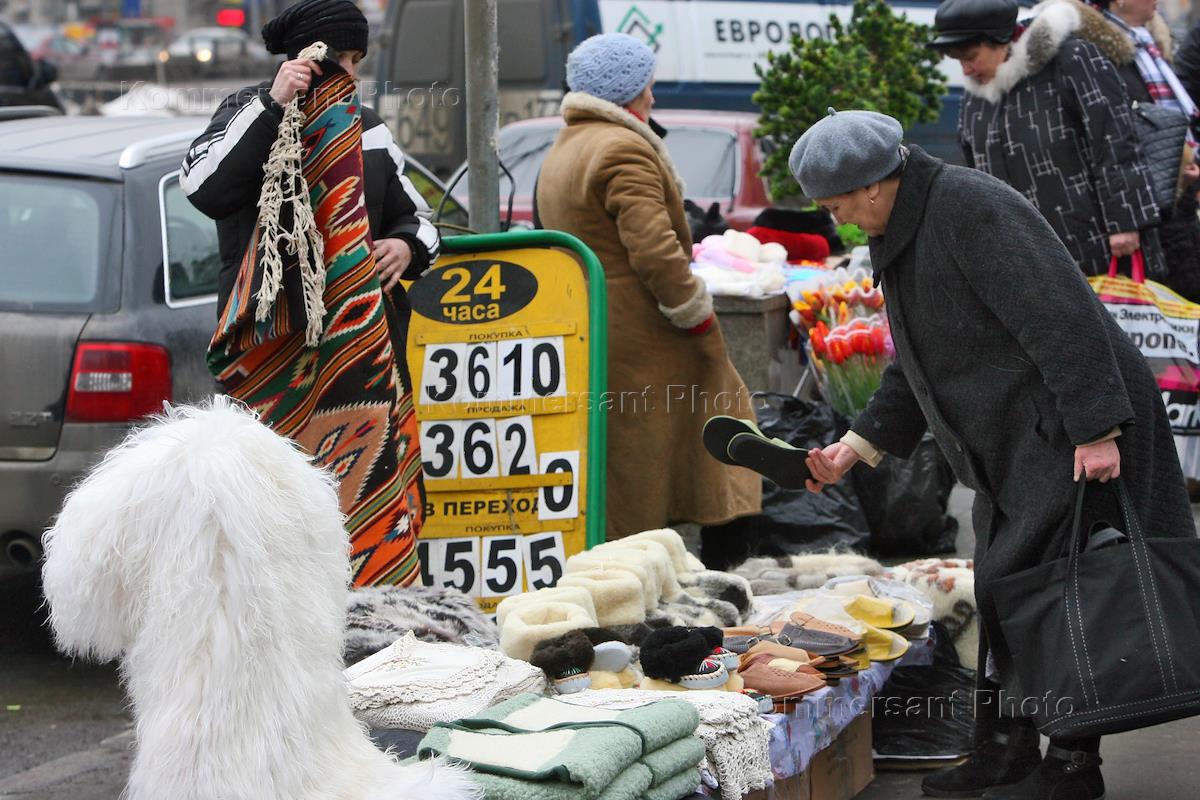 Уличная торговля одеждой и обувью у станции метро "Красная Пресня".