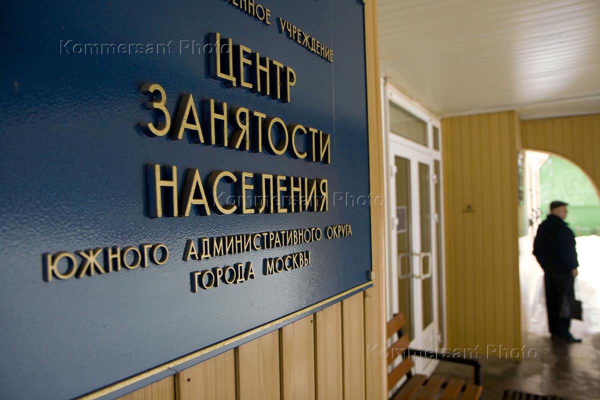 Жанровая фотография. Вывеска Центра занятости населения Южного административного округа (ЮАО) города Москвы на здании Центра.