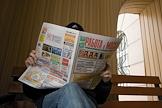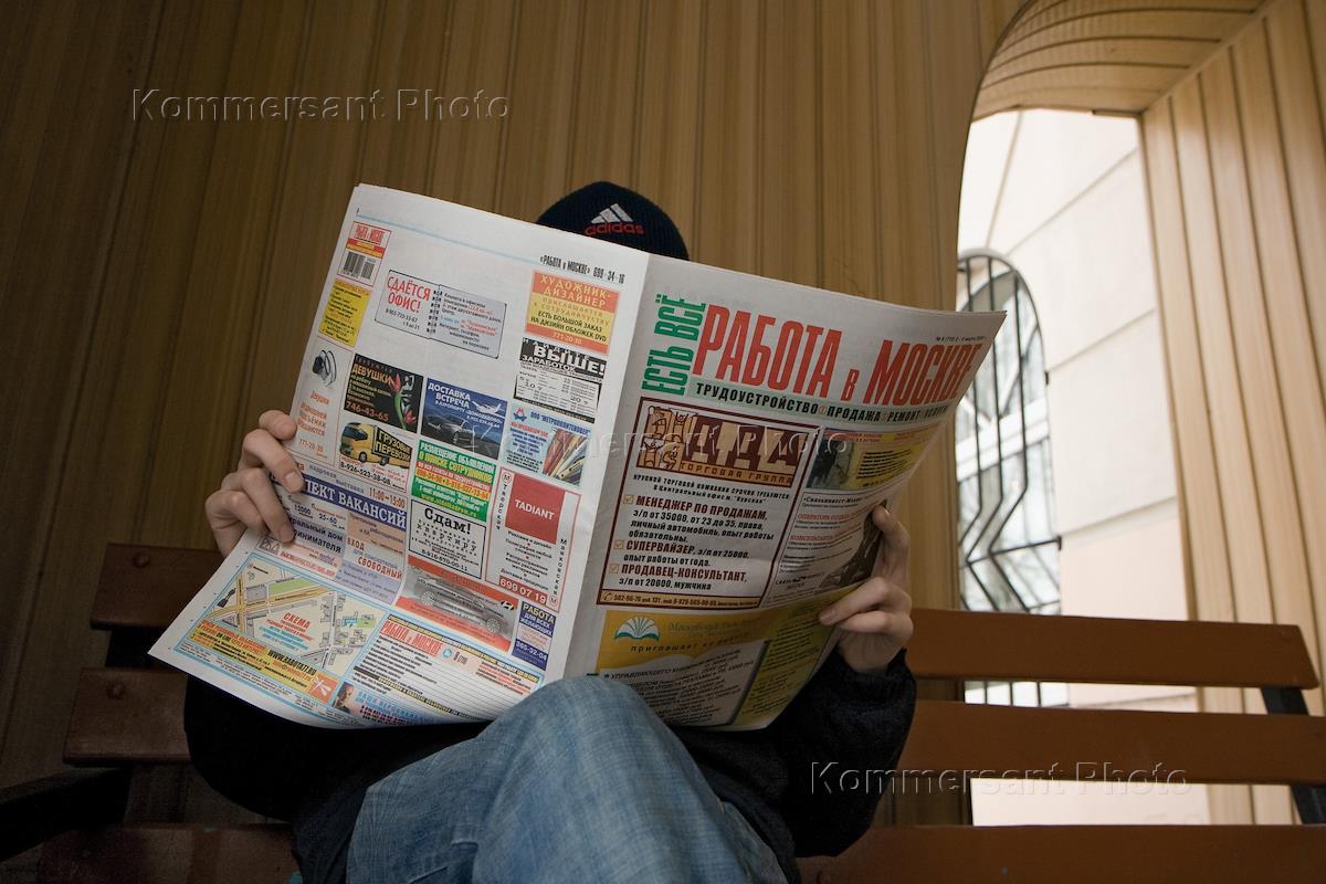 Жанровая фотография. Центр занятости населения. Безработный мужчина читает газету "Работа в Москве".