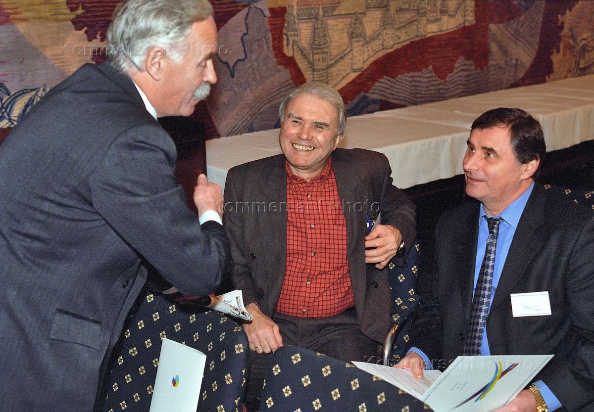 Главный редактор газеты "Московские новости" Виктор Лошак (слева), писатель-сатирик Михаил Жванецкий (в центре) и министр культуры России Михаил Швыдкой (справа) на Всероссийском съезде выходцев из Украины. Съезд проходил в гостинице "Космос".