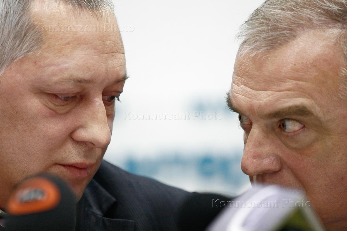 Руководитель Департамента топливно-энергетического хозяйства Москвы Евгений Скляров (слева) и префект Восточного административного округа (ВАО) Москвы Николай Евтихиев (справа) во время пресс-конференции на тему: "Урегулирование ситуации на рынке сбыта электроэнергии в Москве". Пресс-конференция прошла в центральном офисе агентства "Интерфакс".
