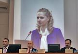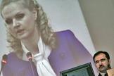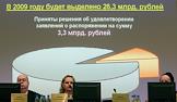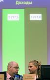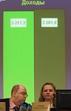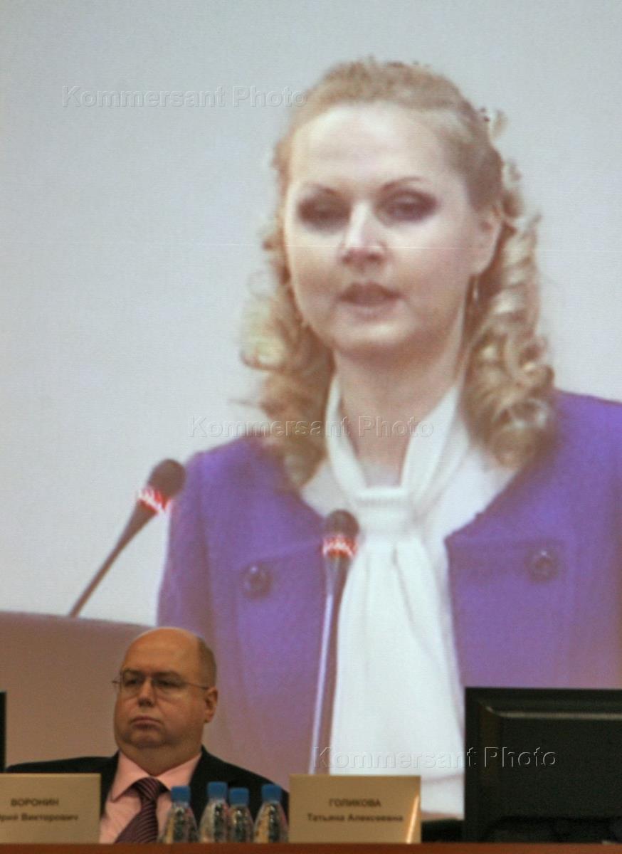 Министр здравоохранения и социального развития России Татьяна Голикова (на экране) и ее заместитель Юрий Воронин (слева) на расширенном заседании правления Пенсионного фонда России.