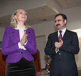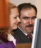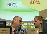 Министр здравоохранения и социального развития России Татьяна Голикова (справа) и ее заместитель Юрий Воронин (слева) на расширенном заседании правления Пенсионного фонда России.