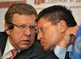 Заместитель председателя правительства России, министр финансов Алексей Кудрин (слева) и первый заместитель председателя Центрального Банка России Алексей Улюкаев (справа) на XI всероссийской банковской конференции "Банковская система в России 2009: стратегия выхода из кризиса". Конференция прошла в "Президент-отеле".