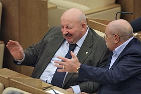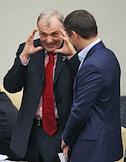 Заместитель председателя комитета Государственной думы России по образованию Гаджимет Сафаралиев (слева) и заместитель председателя комитета Государственной думы России по экономической политике, предпринимательству Борис Зубицкий (справа) на пленарном заседании Госдумы.