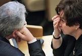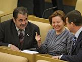 Член комитета Государственная дума России по бюджету и налогам Геннадий Кулик (слева) и член комитета Государственной думы России по делам молодежи Светлана Хоркина (справа) на пленарном заседании Госдумы.
