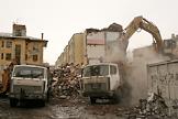 Снос дома на улице Советской, пострадавшего от пожара. Грузовые автомобили на стройплощадке.