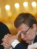 Заместитель председателя правительства России, министр финансов Алексей Кудрин (слева) и председатель Центрального Банка России Сергей Игнатьев (справа) на XX съезде Ассоциации российских банков. Съезд прошел в Колонном зале Дома союзов.