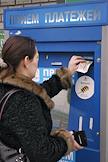 Жанровое фото. Пожилая женщина входит в здание приемной администрации президента России.