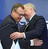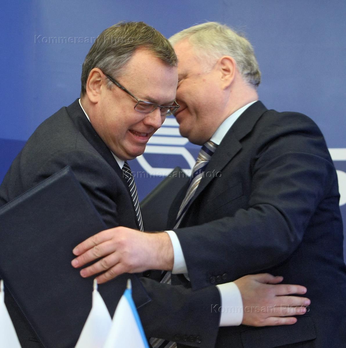 Президент, председатель правления "ВТБ Банк" Андрей Костин (слева) и председатель центрального совета "Динамо" Владимир Проничев (справа) на церемонии подписания меморандума о сотрудничестве между ОАО "Банк ВТБ" и ОГО ВФСО "Динамо", а также договора о спонсорстве между "Банком ВТБ" и ЗАО "Футбольный клуб "Динамо-Москва".