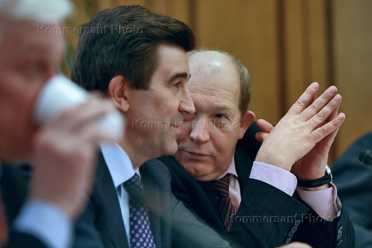 Член комитета Государственной думы России по финансовому рынку Александр Коваль (в центре) и начальник главного управления Государственной инспекции безопасности дорожного движения (ГИБДД) МВД России, генерал-лейтенант Виктор Кирьянов (справа) во время заседания рабочей группы партии "Единая Россия" по реализации проекта "Безопасные дороги". Заседание прошло в Государственной думе России.