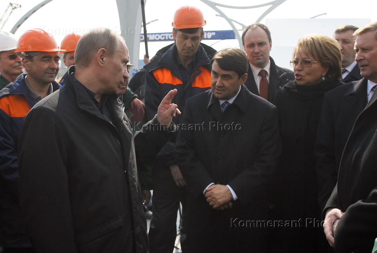 Слева направо: губернатор Санкт-Петербурга Валентина Матвиенко, министр транспорта России Игорь Левитин, полномочный представитель президента России в Северо-Западном федеральном округе (СЗФО) Илья Клебанов, председатель правительства России Владимир Путин и его заместитель Сергей Иванов во время осмотра хода строительства автомобильной дороги - Западный скоростной диаметр (ЗСД).