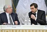 Уполномоченный по правам человека в России Владимир Лукин (слева) и первый заместитель руководителя администрации президента России Владислав Сурков (справа) на заседании Совета по содействию развитию институтов гражданского общества и правам человека в Кремле.