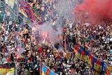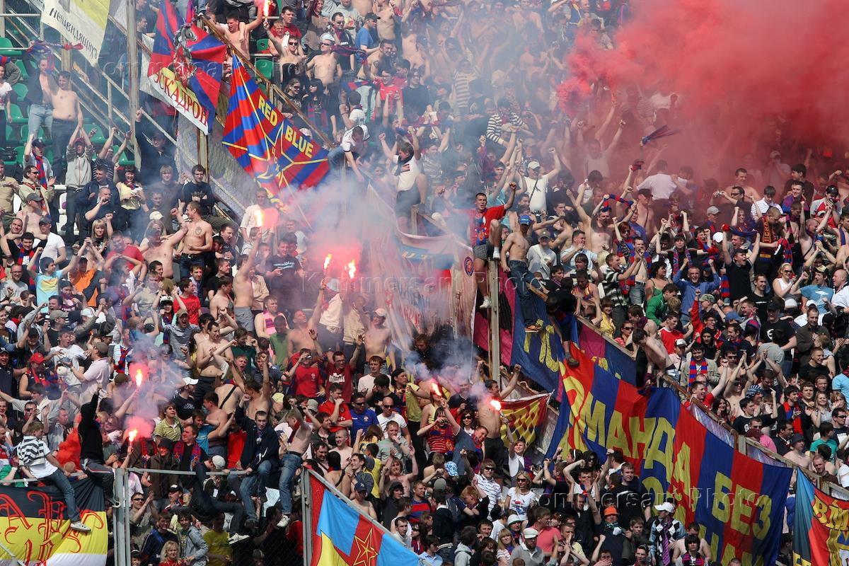 Росгосстрах. Чемпионат России по футболу. 7 тур. Матч между командами "Крылья Советов" (Самара) - ЦСКА (Москва) на стадионе "Металлург". Болельщики команды ЦСКА на трибуне во время матча.