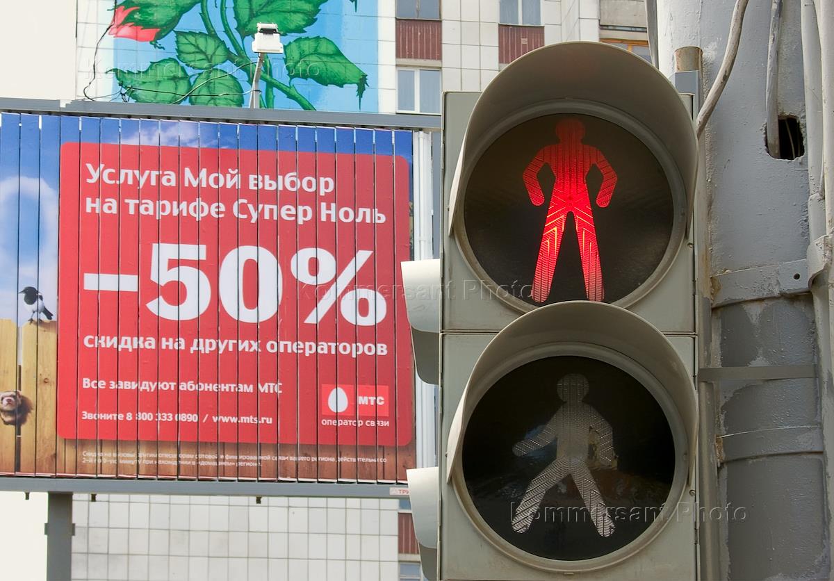 Жанровая фотография. Красный сигнал светофора и рекламный щит оператора сотовой связи МТС "Услуга "Мой выбор" на тарифе "Супер Ноль" - скидка 50 процентов на других операторов".