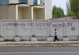 Жанровая фотография. Женщина идет на фоне забора с надписями: "Эдуард Лимонов - наш президент" и "Nazbol.ru".