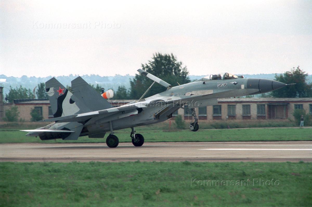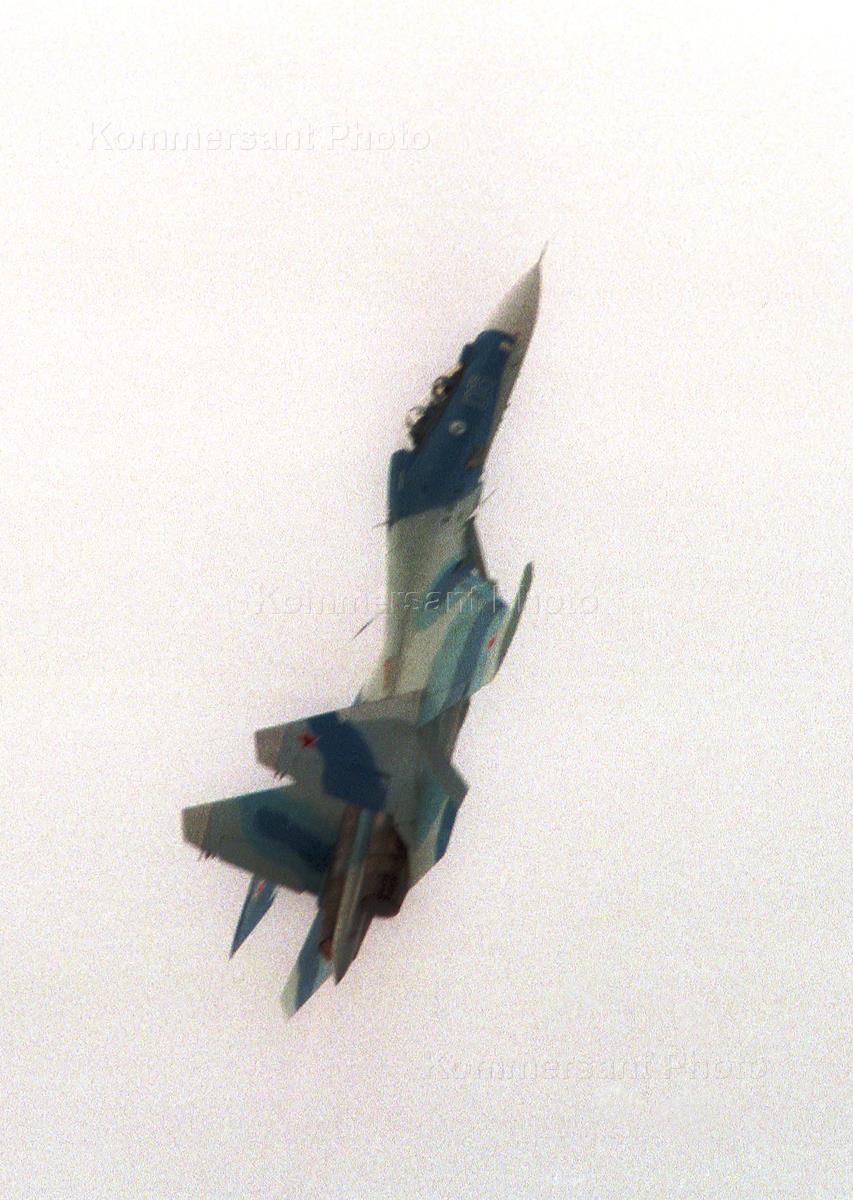 Самолет "С 37" Беркут, с обратно-стреловидным крылом, созданный конструкторским бюро Сухого, во время показа на авиашоу в рамках открытия Московского Авиакосмического салона "МАКС 99".