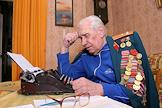 Жанровая фотография. За столом у пишущей машинки сидит ветеран в парадном кителе с орденами.