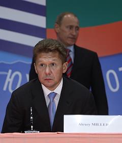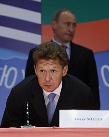 Председатель правительства России Владимир Путин (слева) и председатель правления ОАО "Газпром" Алексей Миллер (справа) во время церемонии подписания пакета документов по развитию проекта "Южный поток". Церемония прошла в конгресс-холле отеля "Рэдиссон САС Лазурная".