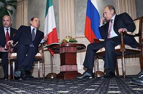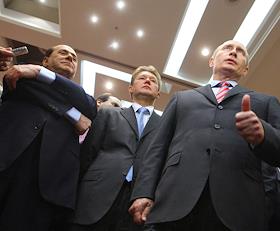 Полномочный управляющий итальянской нефтегазовой группы ЭНИ (Eni S.p.A.) Паоло Скарони (слева), председатель Совета министров Итальянской Республики Сильвио Берлускони (второй слева) и председатель правительства России Владимир Путин (справа) во время встречи в отеле "Рэдиссон САС Лазурная".